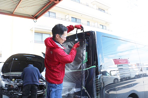 ガラス接着前にカーフィルムを施工。