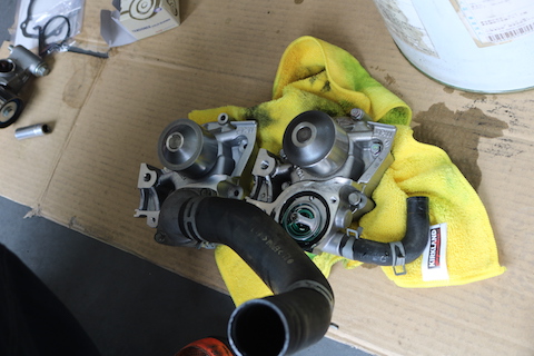 そして、タイミングベルトを交換するのですが、ベルトを外してやっと見えるウォーターポンプ。