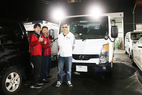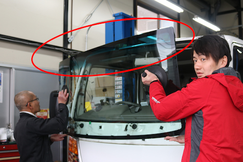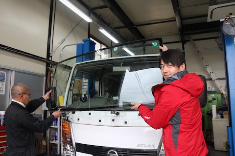 京都府よりニッサン アトラスのお客様、フロントガラス交換でご来店。
