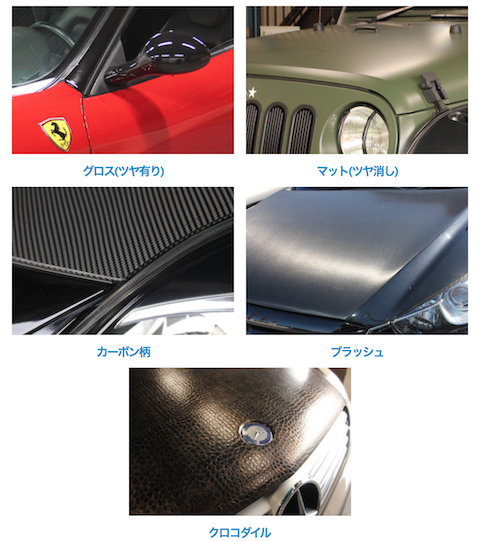カーラッピングシートには多様な色と柄があります。グロス(ツヤあり)、マット(ツヤ消し)、メタリック、マジョーラ、ホログラム、メッキ、カーボン柄、ヘアライン柄、ワニ柄、皮柄などがあります。
