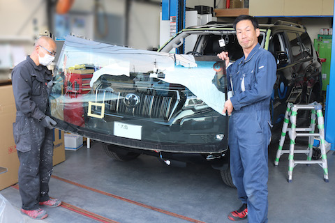 ランドクルーザーのお客様のフロントガラスに飛び石被害で大きなヒビ割れ。