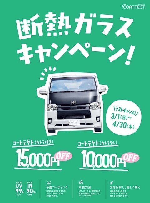 - コートテクト断熱フロントガラス交換、キャンペーンで1.5万円引き!