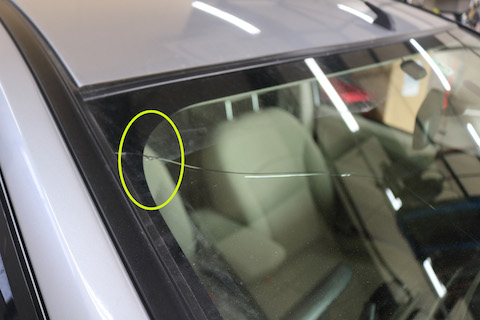 フロントガラスの端側に飛び石被害で、ヒビが伸びてしまい、