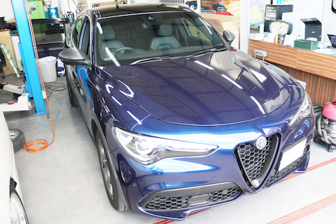 アルファロメオのSUV ステルヴィオのお客様、ルーフをグロスブラック(ツヤあり)でカーラッピングのご依頼を頂きました。