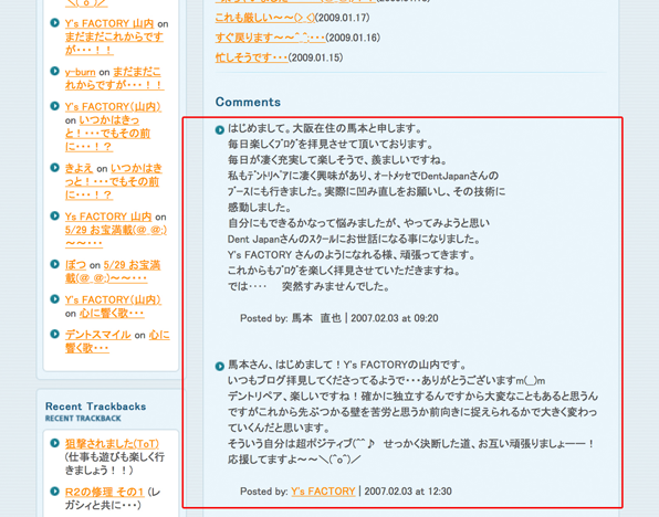 しかし、不安に思っていた私は、インターネットでデントリペアについて調べていると、目にとまるホームページがありました。Y`sファクトリーの山内社長のページでした。山内社長はこの技術で成功している数少ない1人でした。不安だった私は、思いきってY`sファクトリーの山内社長のブログにコメントを入れました。そして、直ぐ来た返信に勇気づけられたのでした。