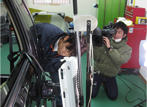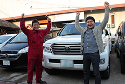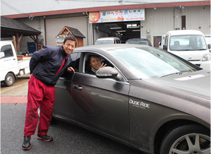 首藤さんといっしょに。首藤さんは、自動車のオークション会場に、私をよく連れて行ってくれました。道中は、自動車整備工場の様々なお話です。経営のことから技術のことまでいろんなことを学びました。