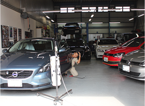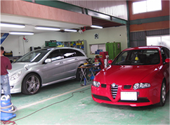 整備工場(四代目)。毎日たくさんの愛車がズラリと並びます。