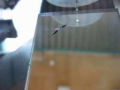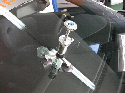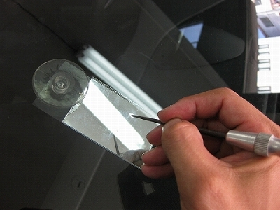 | キズがよくわかるようにフロントガラスの裏側に鏡を取り付けます。これできっちりキズを確認することができます。 | キズが繋がっていない場合などは、強制的にキズに割りをいれたりキズ口を押してキズの状況を見極めてリペアしていきます。 | |