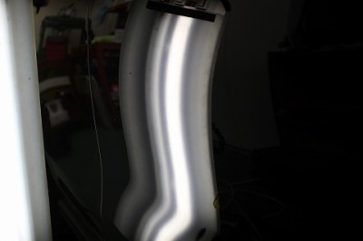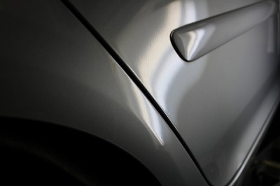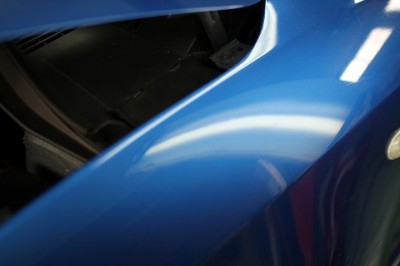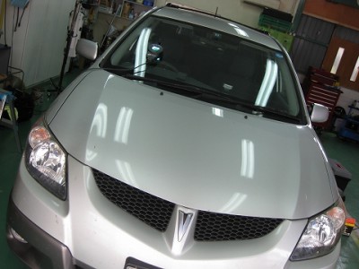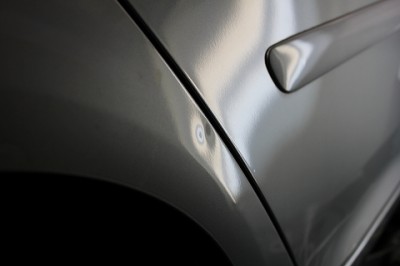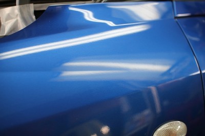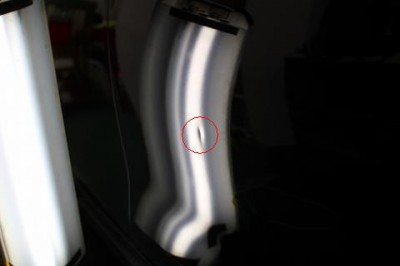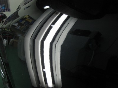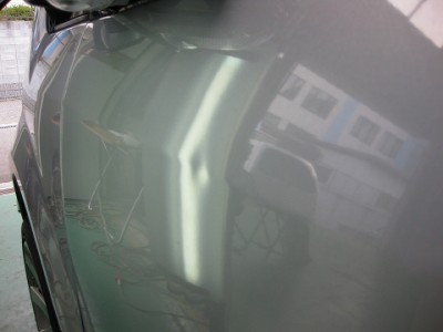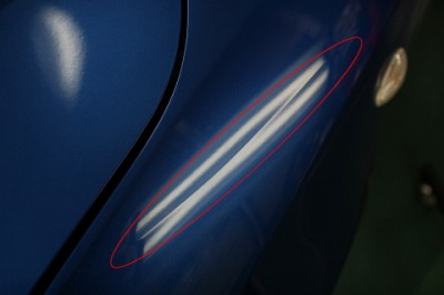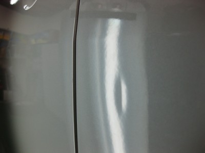 | このような横長のへこみ(クリスデント)はちょっぴり難易度が上がりますので、 お車を預からせて頂きました。 | 少しづつ仕上げていきます。この時のポイントとしてへこみの中心を絶対に外さ ないように、注意しデントリペアしていきます。 | |