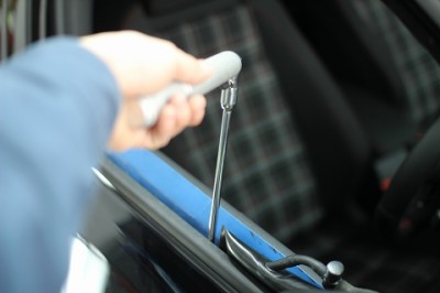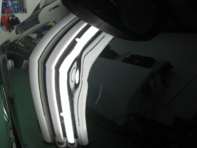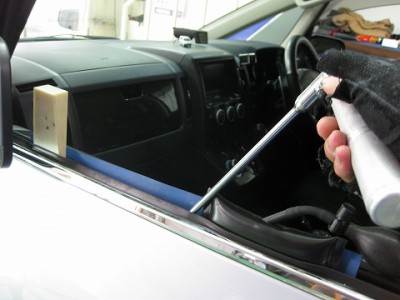 | フロントガラスを全開に下ろし、エアパットで少し広げてあげます。 あとは、最適なデントリペアツールを入れて少しずつ押し上げ直します。 | ほんとデントリペアはアナログなリペア方法なんです。 少しづつ少しづつへこみを直していくんです。 | |