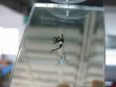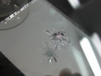| バチンっと運転席の目の前に飛び石によるガラスの割れが出来てしまったとの 事でした。車検との事できっちりガラスリペアさせて頂きました。 | こんな割れです。運転の最中にとても気になるキズですよね!!きっちりガラス リペアすれば目立たなく、かつ強度もぐんっと上がりますからメリット大です。 | |