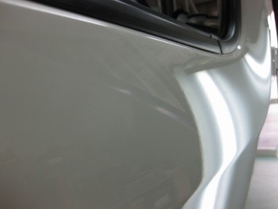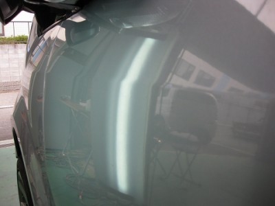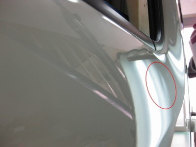 | 大阪府吹田市より三菱デリカD5でのご来店です。 | へこみはプレスライン部分にありました。 | |