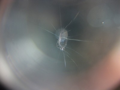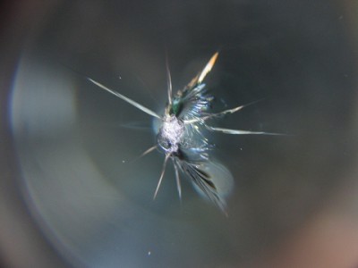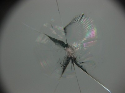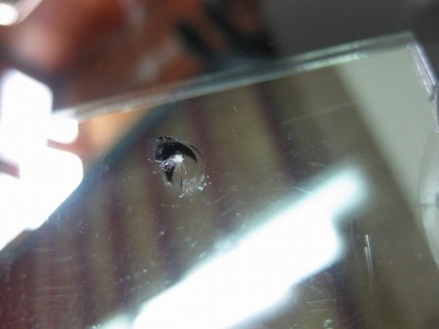 | その被害のキズはこちらになります。フロントガラスの端に近くて今にも伸張し そうなキズでした。 | フロントガラスの端っこにキズがあるからといってフロントガラスの交換は「ちょっ と待って下さい。」普通ガラスの端から10cmや15cm以内はウインドリペア不可 って事になっていますが、状況によっては全く問題なくリペアできますので、諦め ずにウインドガラスリペア専門店へご相談ください。少々リスクはありますが。。。 | |