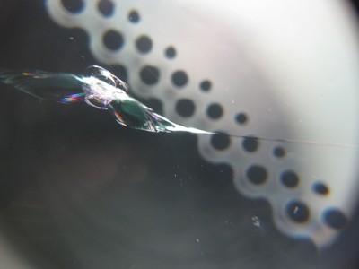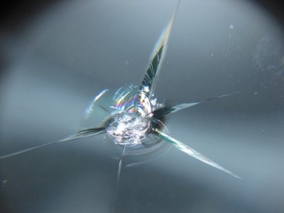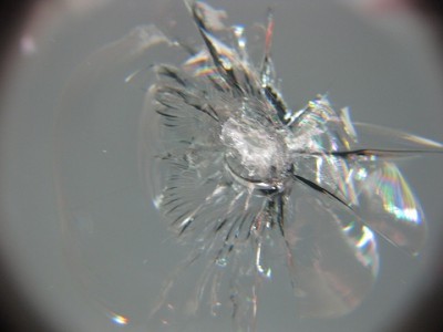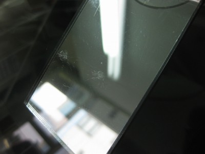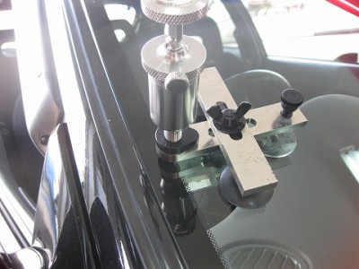 | 飛び石によるフロントガラスの割れです。 バシッと大きな音と共に割れるこの被害。 | キズが良く分かるようにガラスの裏側に鏡を取り付けてキズの状態を見極めま す!!これが非常に重要です。 | |