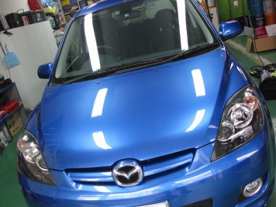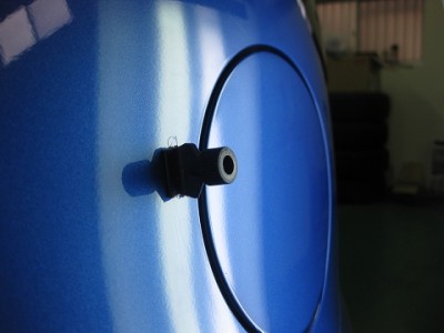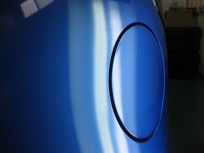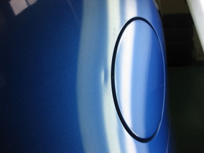 | 大阪府寝屋川市よりご来店はマツダ デミオ。デントリペアでのご来店です。 | ちょうどガソリンの給油口前側部分。この場所は補強が入っており、デントリペア ツールでのアクセスは不可。今回は引っ張りました。 | |