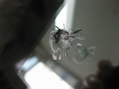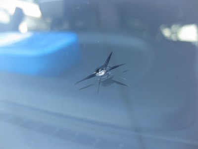 | ウインドガラスの割れだけは、ほんと防ぐ事ができません。お客様も昨日高速 道路を走行中に被害に遭われたとの事でした。 | 衝撃点も大きく、強いパワーで石ころが飛んできたのでしょう!! | |