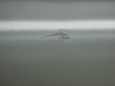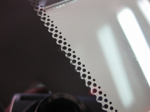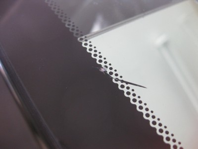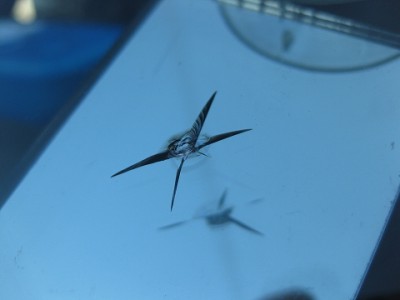 | キズはこちらになりますが、ガラスの端から約3cmあたりの飛び石。 通常、ウインドリペアではガラスの端から10cm~15cmはリペア不可とされて います。何故か?合せガラスは端へ行くほど強度も弱くなり、伸張しやすいから です。 | って事は、フロントガラス交換??? この為だけにフロントガラス交換に数万円払うのは痛い出費だとは思いません か!私なら絶対に落ち込むこと、間違いありません!! | |