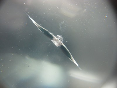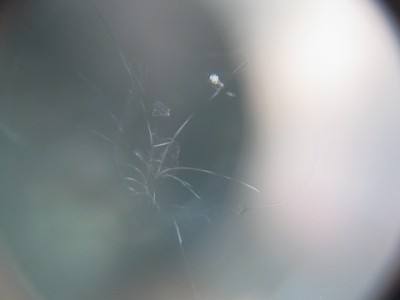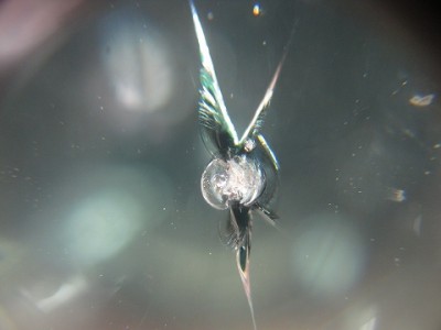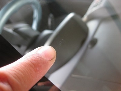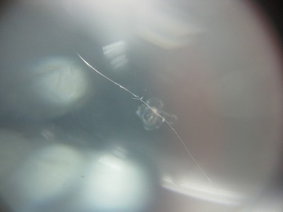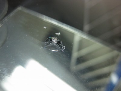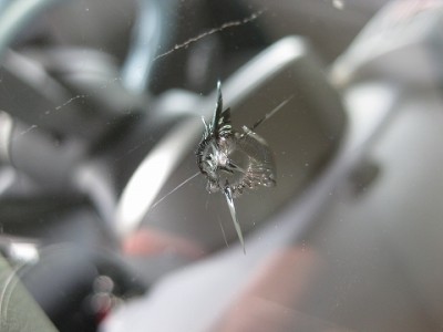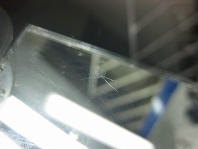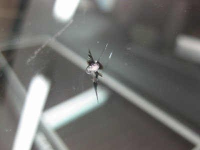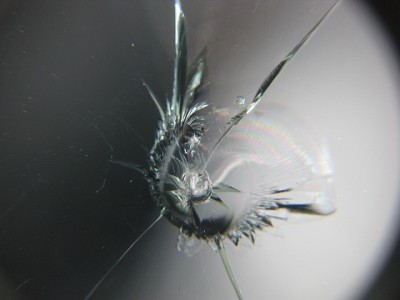| 今回ウインドガラスリペアさせて頂いたキズです。 | もの凄く大きな音がしたとオーナー様。経験された方はお分かりかと思います が、飛び石による割れはビックリするくらい大きな音がします。 | |