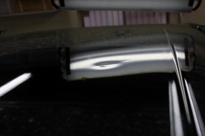 | ルーフのデントリペアでのご来店でした。 | そのへこみがコチラになります。オーナー様は全く記憶が無いというこのへこみ。何かが鋭く当たってできたと思われるへこみでした。 | |