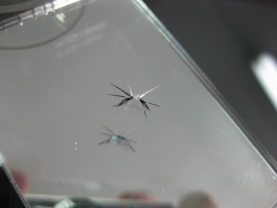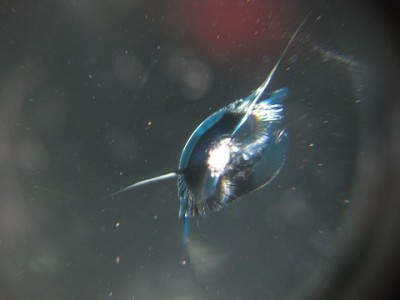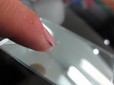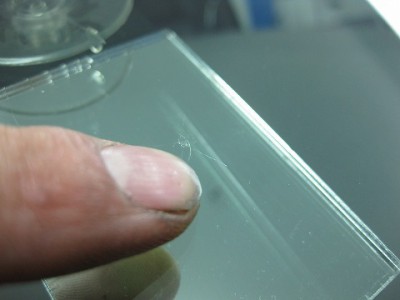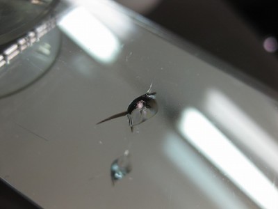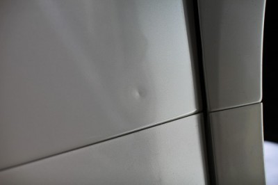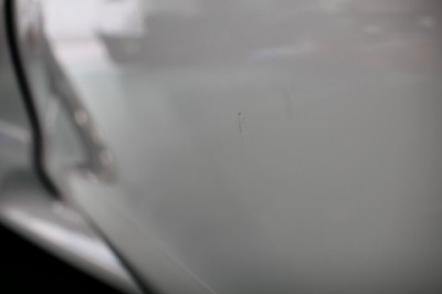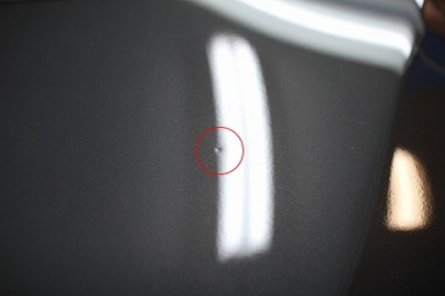 | 見た感じ凄く小さくて簡単そうに見えますが、中心にキズがあり鋭角にへこんで おります。 | 別の写真です。このようなへこみの場合、中心を強くデントリペアツールで突い てしまうと、塗装が割れてしまいます。 今回はへこみの場所もやり難く、アクロバティックな体勢でデントリペアしました。 | |