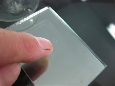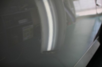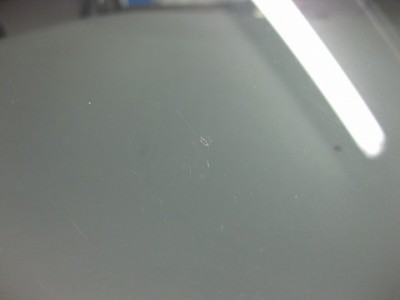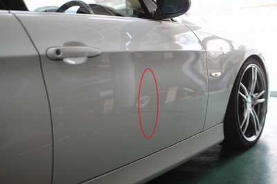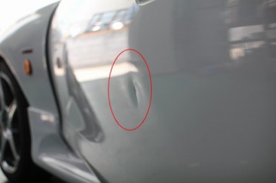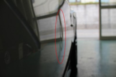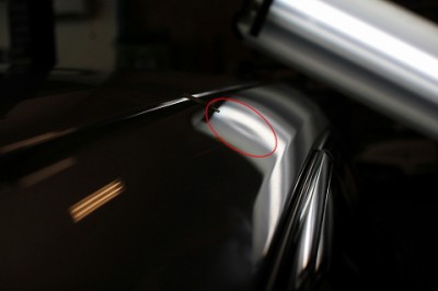 | 今回のご紹介は凄く小さなへこみ。 お分かりになりますか?赤丸部分のへこみです。キズもあります。 このようなへこみでも、横から透かして見て見ると案外目立ちます。そして以外 に大きくへこんでいます。 | ||