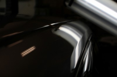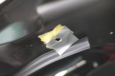 | 今回のへこみの場所はボンネット先端部分でしたので、このような小さな穴から デントリペアツールを入れてデントリペアしていきます。 | アルミボンネットでしたが、全く問題ありません。 このようなへこみの場合、ちょっとお待ちいただく間に完成致します。キズはどう しても残りますが、へこみが無くなる事によってキズも目立たなくなります。 | |