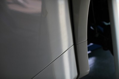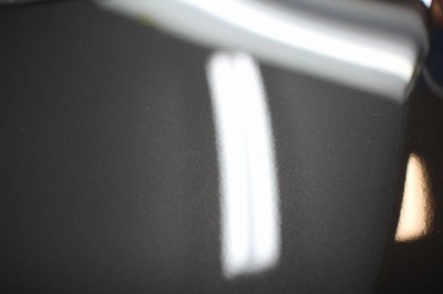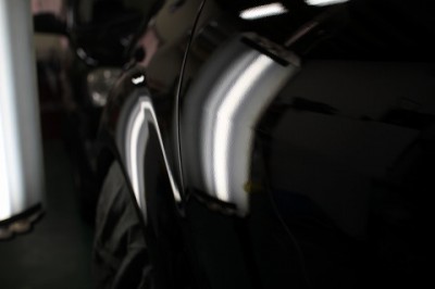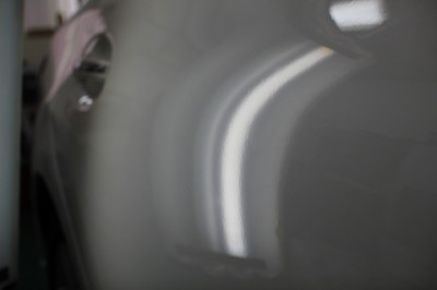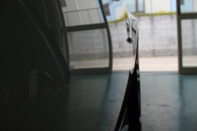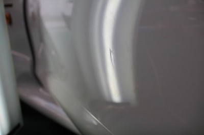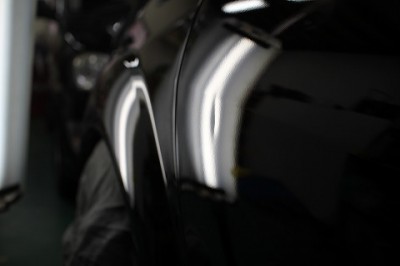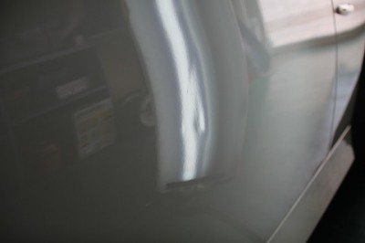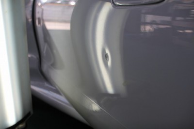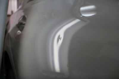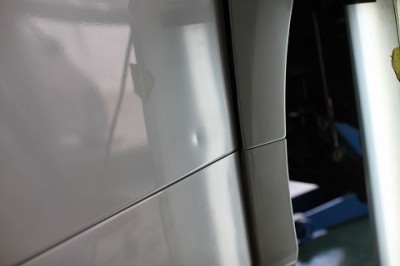 | 別の角度からの写真です。無理に裏からデントリペアツールで押すと塗装が割 れてしまうので、慎重に施工していきます。 | へこみの衝撃点は相手の塗料が付着しておりましたが、軽くコンパウンドで磨く 事でキレイになりました。 | |