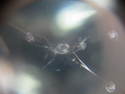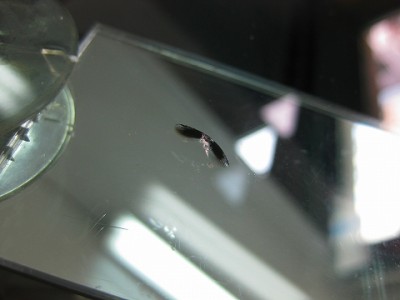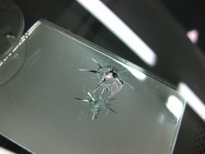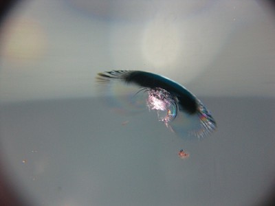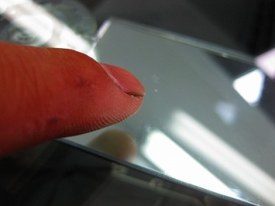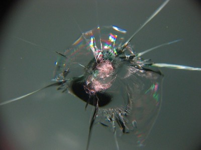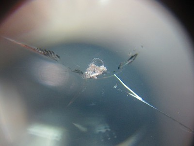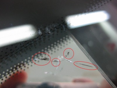 | 赤丸部分の黒い影が空気です。きっちりと真空にせずにレジン(ガラス用の接着 剤)を注入した為に空気が抜けずに残っています。 この空気がキズの伸張に大きく影響します!この空気がどこかに逃げたがり、 ガラス強度の弱いガラスの端っこに伸びようと力が働きます。 | ||
