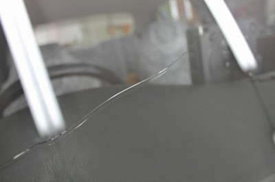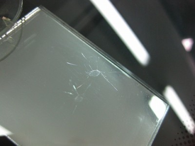 | 今回は運悪くガラスの端っこに近いところに石ころが当たってしまいました。 | その為に、一瞬でこんな感じに伸びてしまったのです。 | |