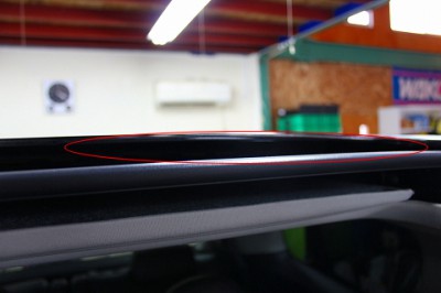 | サンルーフを全開にして、写真の赤丸部分の隙間からデントリペアツールをアク セスさせると、難なくへこみに届きました。へこみに届けば、お任せ下さい!! | オーナー様にもめっちゃ喜んで頂け、これぞデントリペアのメリットが発揮できま した。 | |