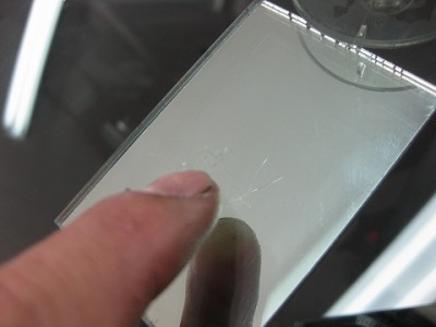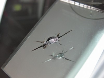 | このようなフロントガラスの飛び石による傷は、伸張していきますので、 早めの修理が必要です。 | このようなキズはウインドリペアで修理が可能です。傷が伸びてしまうと、 フロントガラス交換となりますので、ご注意下さい!! | |