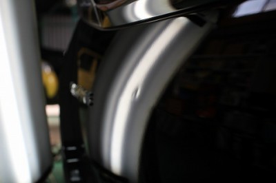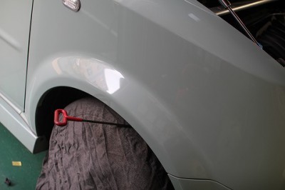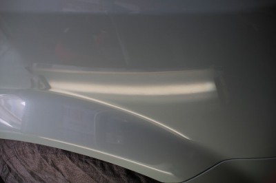 | このようなへこみの場合、タイヤハウス内のカバーを外せば、難なくデントリペア ツールも入りますのでご安心下さいませ。 | 復活でございます。そして、オーナー様にも喜んで頂けました。 このようなへこみはデントリペアが一番得意としていますので、 まずはご相談くださませ!! | |