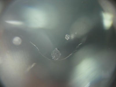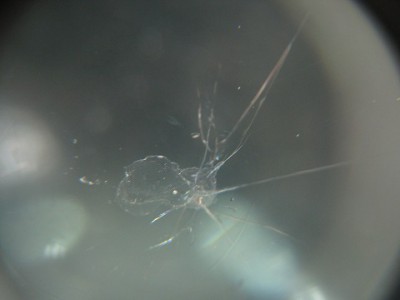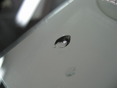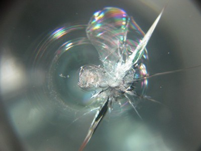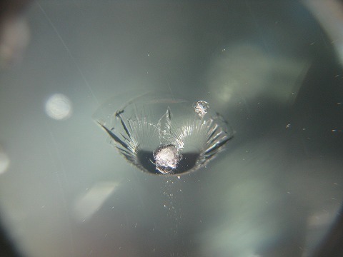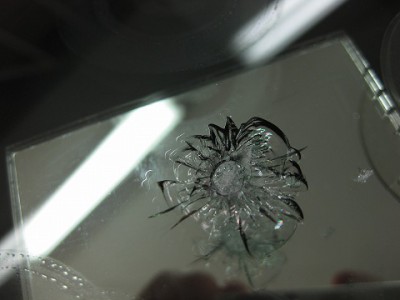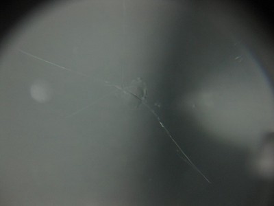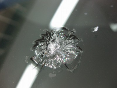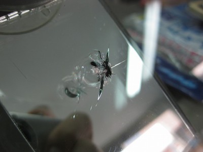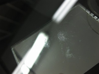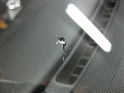 | フロントガラスの交換をどうしても避けたいとのご依頼で、全力でウインドリペア させて頂きました。 | レジン(ガラス用の接着剤)はきっちり入りましたので、格段に強度は増しており ます。こちらも問題なく車検に合格いたしますのでご安心ください。 | |