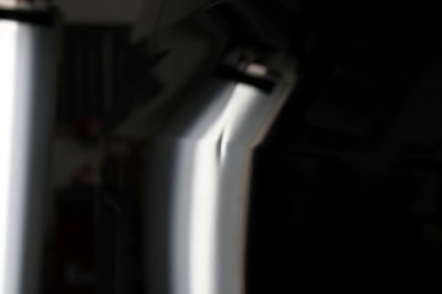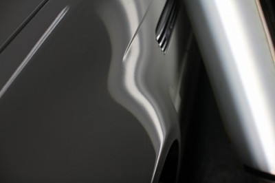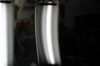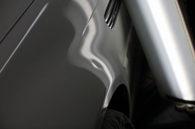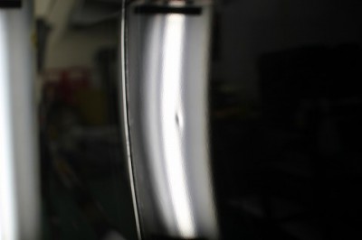 | 自転車のグリップか何かが当たったとの事でした。蛍光灯を当ててへこみを 確認すると、歪な形をしてへこんでおりました。 | この場合、フロントフェンダー部分の裏側のカバーを外して裏側から押し出して いきます。 | |