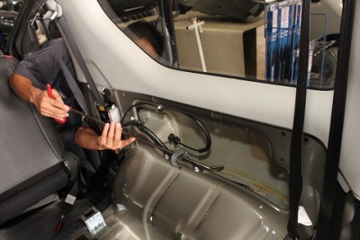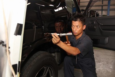 | 表からも叩いて修正し、歪みを消していきます。塗装面にはキズはつかないのでご安心ください。 | そして、やっぱりメインは裏からへこみを押して直す。これがデントリペアの技なんです!! | |