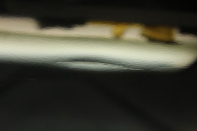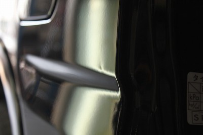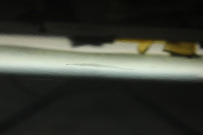 | リアクオーター前方にキズを伴った小さなへこみがありました。 | もう一カ所はタイヤハウスの上あたりに・・こちらもキズを伴った小さなへこみ。 | |