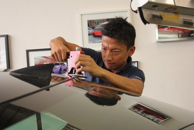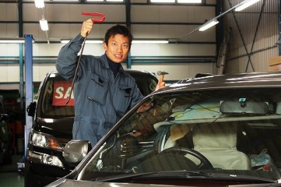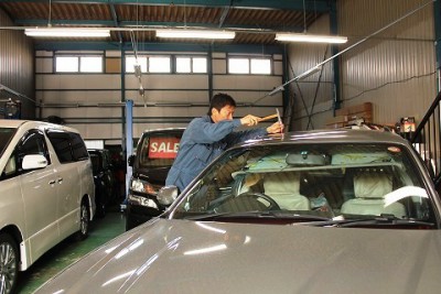 | 表から叩いて、ひずみを抜いていきます。 | ちょっとお待ち頂いている間に直るレベルでは無かったので、当店の代車を使って頂き、ゆっくりじっくりデントリペアさせて頂きました。 | |