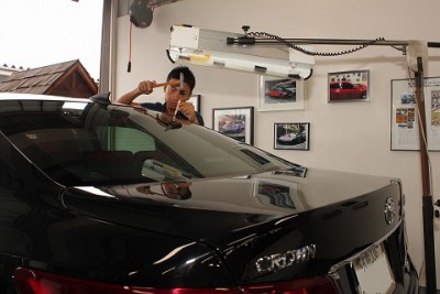| 大阪府寝屋川市よりご来店いただきました、トヨタ クラウン☆ ルーフに凹みが二箇所ありました。 | 今回はオーナー様のご要望で内張りを外さずに、表から引っ張って欲しいとのご要望でした!! | |