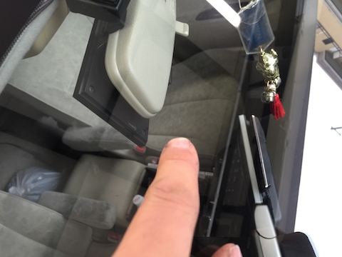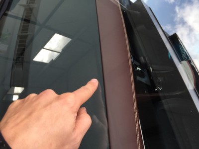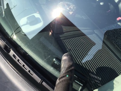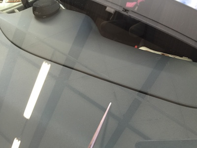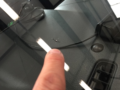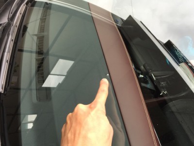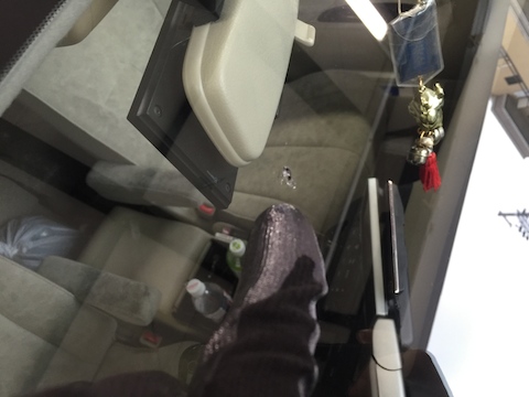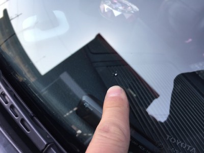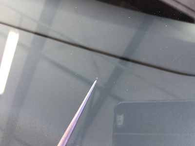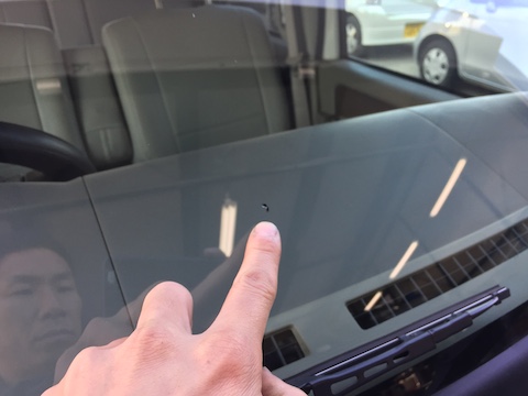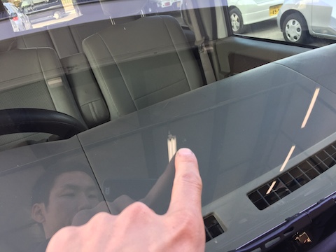 フロントガラスに飛び石が当り、小さな傷が出来てます。新品のピッカピカのガラスに、この傷は目に入ります!