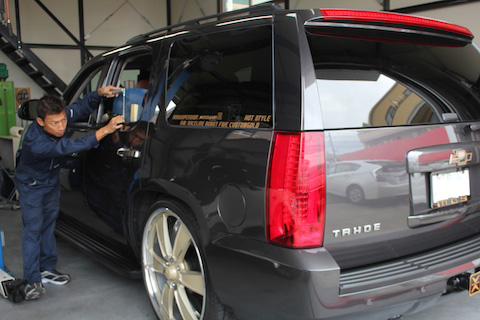 お客様が喜んだ表情を見るのが、たまらない瞬間です!以前にも、デントリペアでご来店した事があるリピーター様。お車が、シボレー タホに変わっても、へこみのご依頼をして頂き、