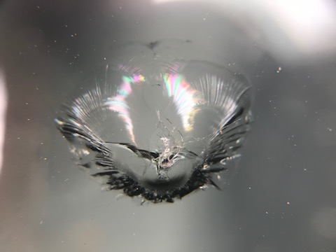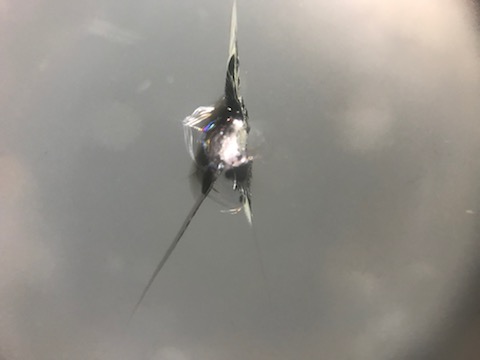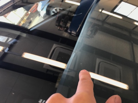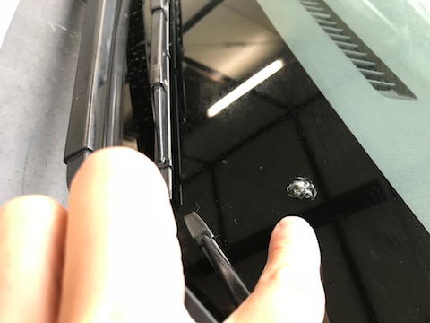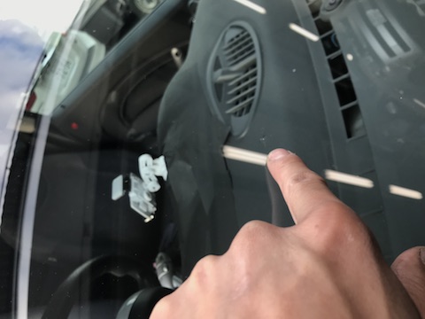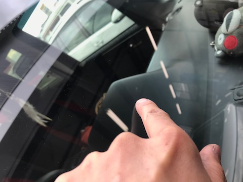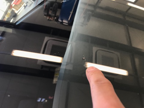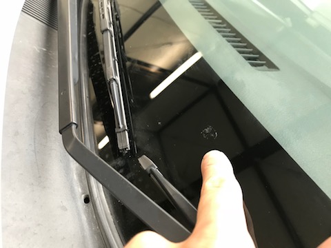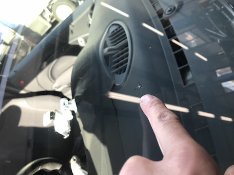 フロントガラス下側に飛び石被害!ガラスの端から10cm以内の傷は、業界では交換となってしまう場所。
