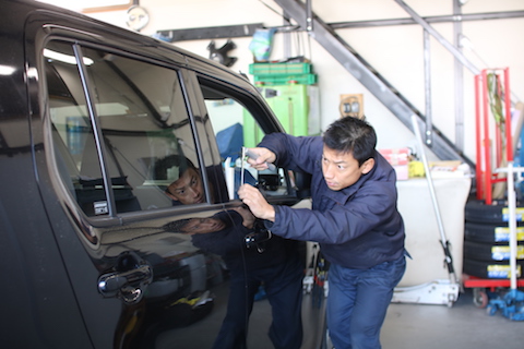 特殊工具を窓ガラスの隙間から入れて、ヘコミを押し出し、
