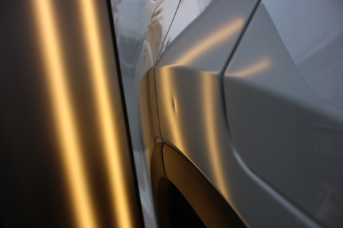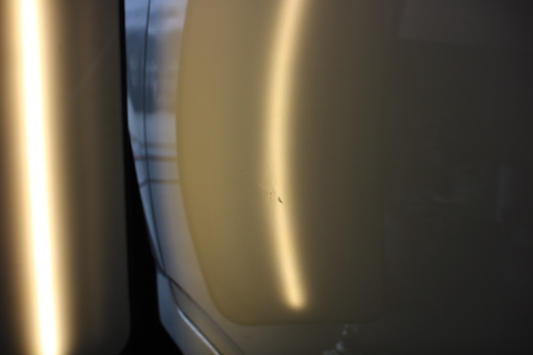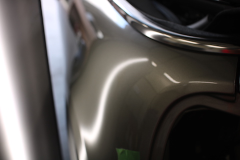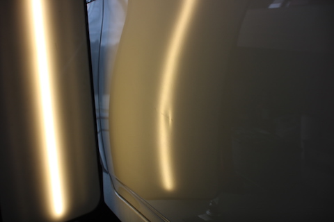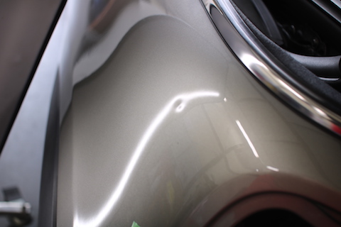 左後ろクォーターにできたヘコミ。ピッカピカのボディにヘコミはよく目立ちます。