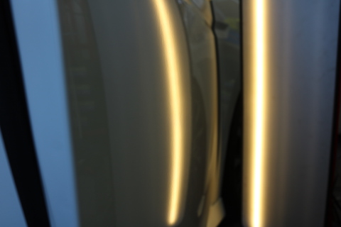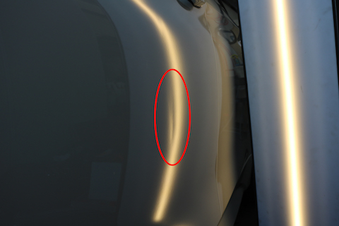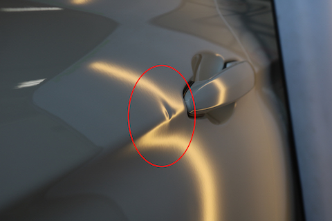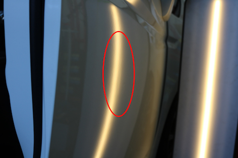 左前ドアにできたプレスラインのヘコミ。