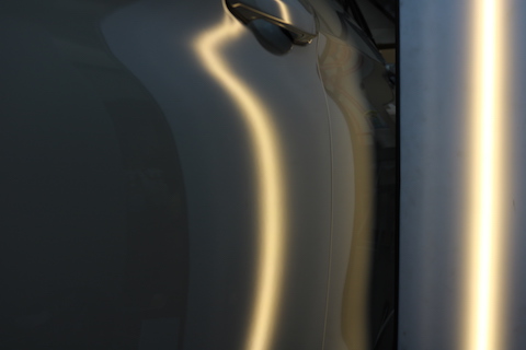 輸入車のかたい鉄板、プレスラインと、デントリペアでは難しい施工となりますが、