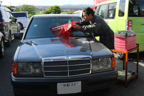京都府より30年前に購入したベンツ190Eのお客様、フロントガラスにヒビが入ったとご来店。