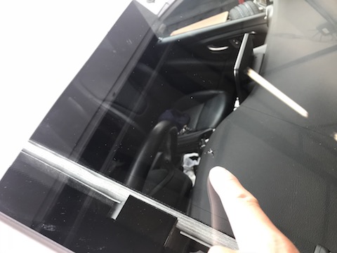 近くでみると、フロントガラスにヒビが入っています!このまま放置すれば、温度差や車のねじれなどで、傷が伸びて高額なガラス交換となってしまいます。