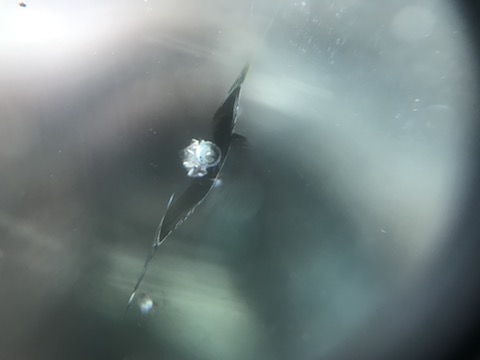 近くで見ると、ヒビがはいっています。気付かずに放置すると、傷が伸びて高額なガラス交換となってしまいます!