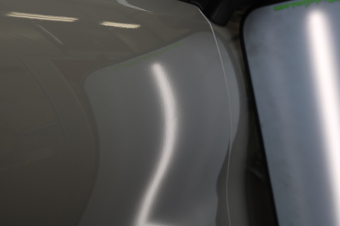 フェンダーにドアパンチ被害?のようなヘコミ。塗装で修理すると、数日お預かりしないといけない、パールホワイトだから色合わせ大丈夫?といろんな不安がありますが、