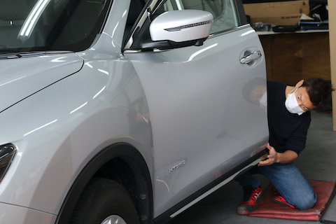 日産 エクストレイルの助手席ドア下側に大きなヘコミ。